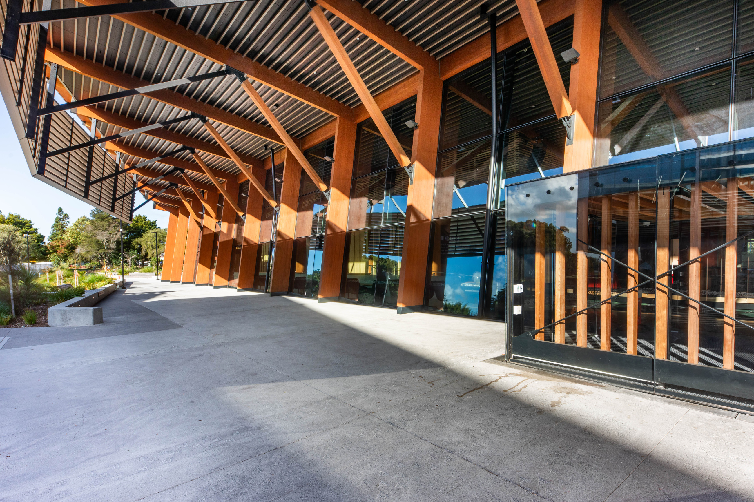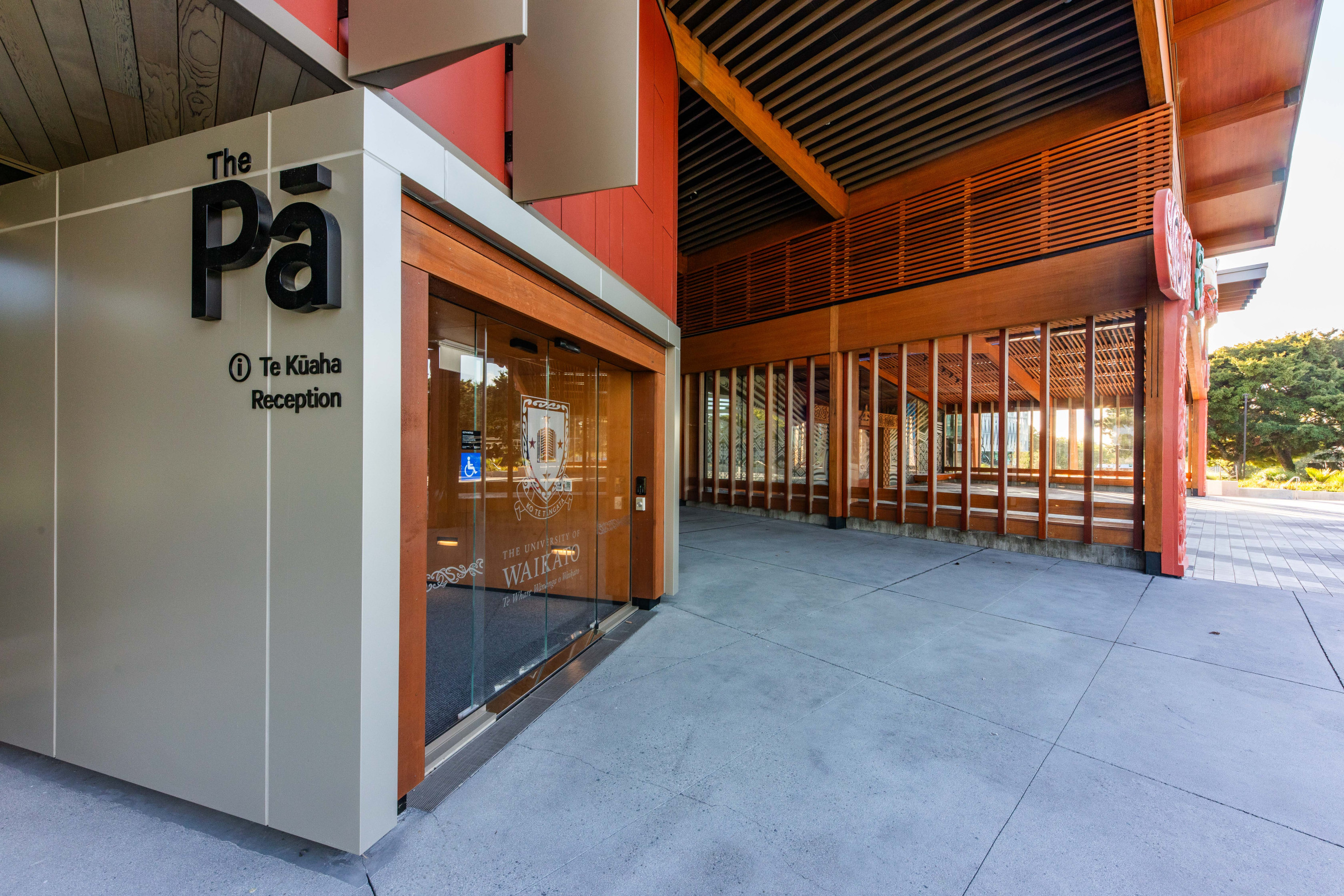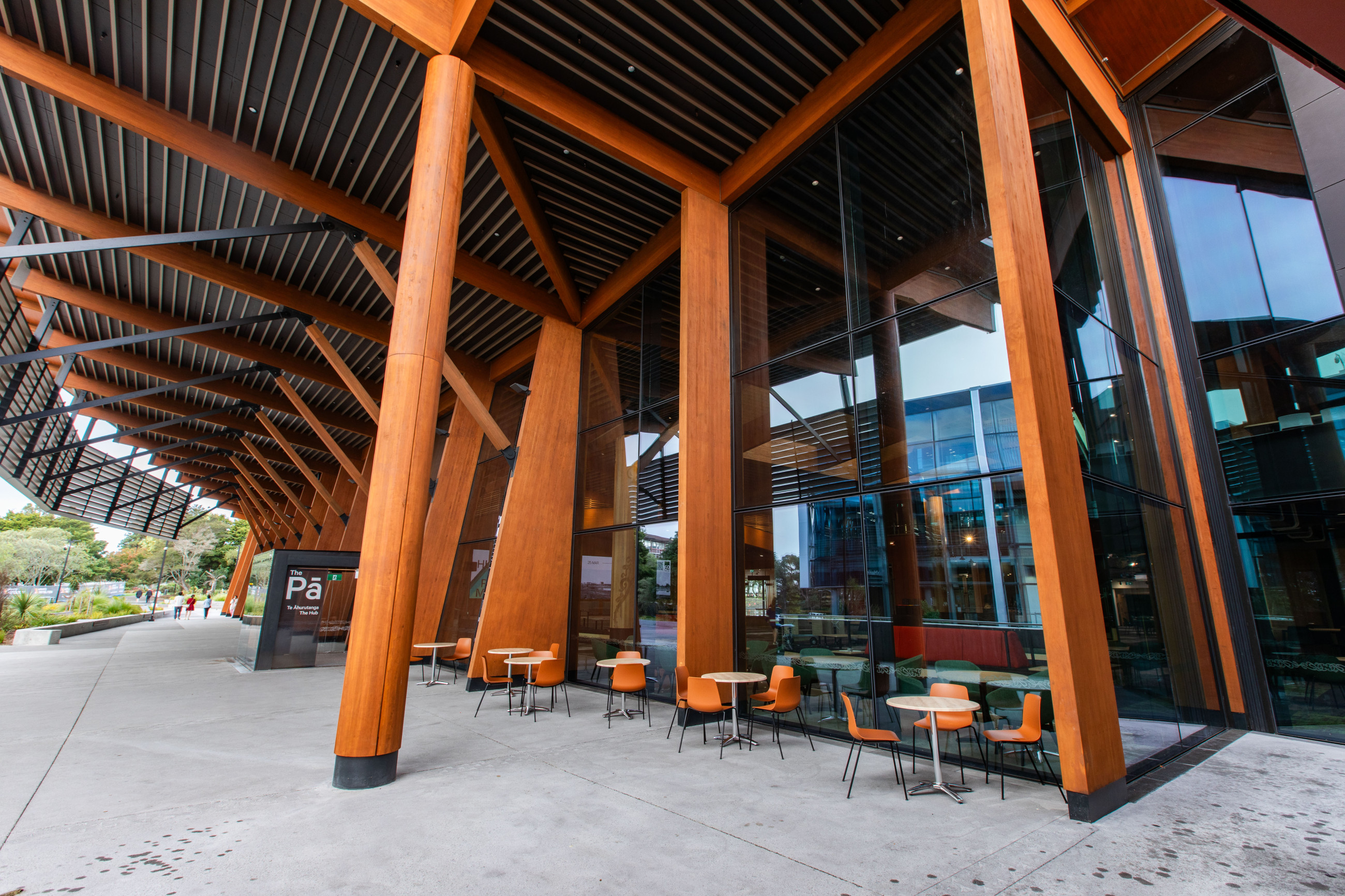 The Pā precinct provides a new main entrance at the heart of the University Campus and is based around the concept and form of a Wharenui (central meeting place). It is made up of multifunctional spaces that include a student hub, university reception, faculty offices, retail, and other student services. There is also a generous courtyard, central campus walkway and other landscaped areas.