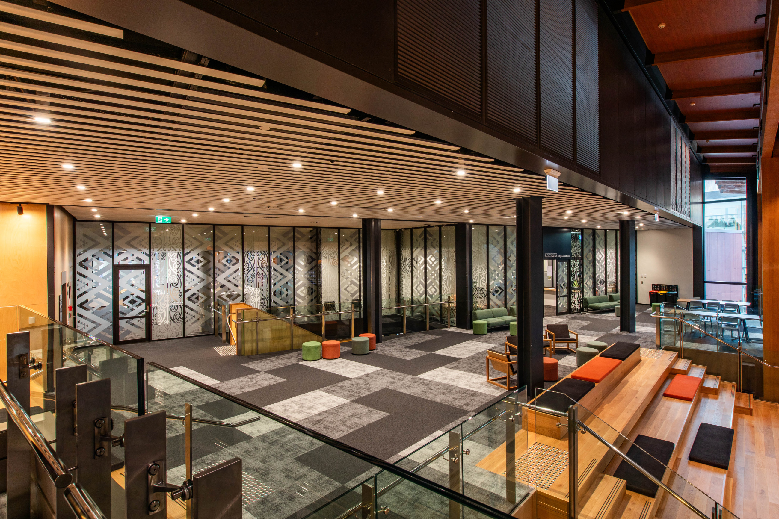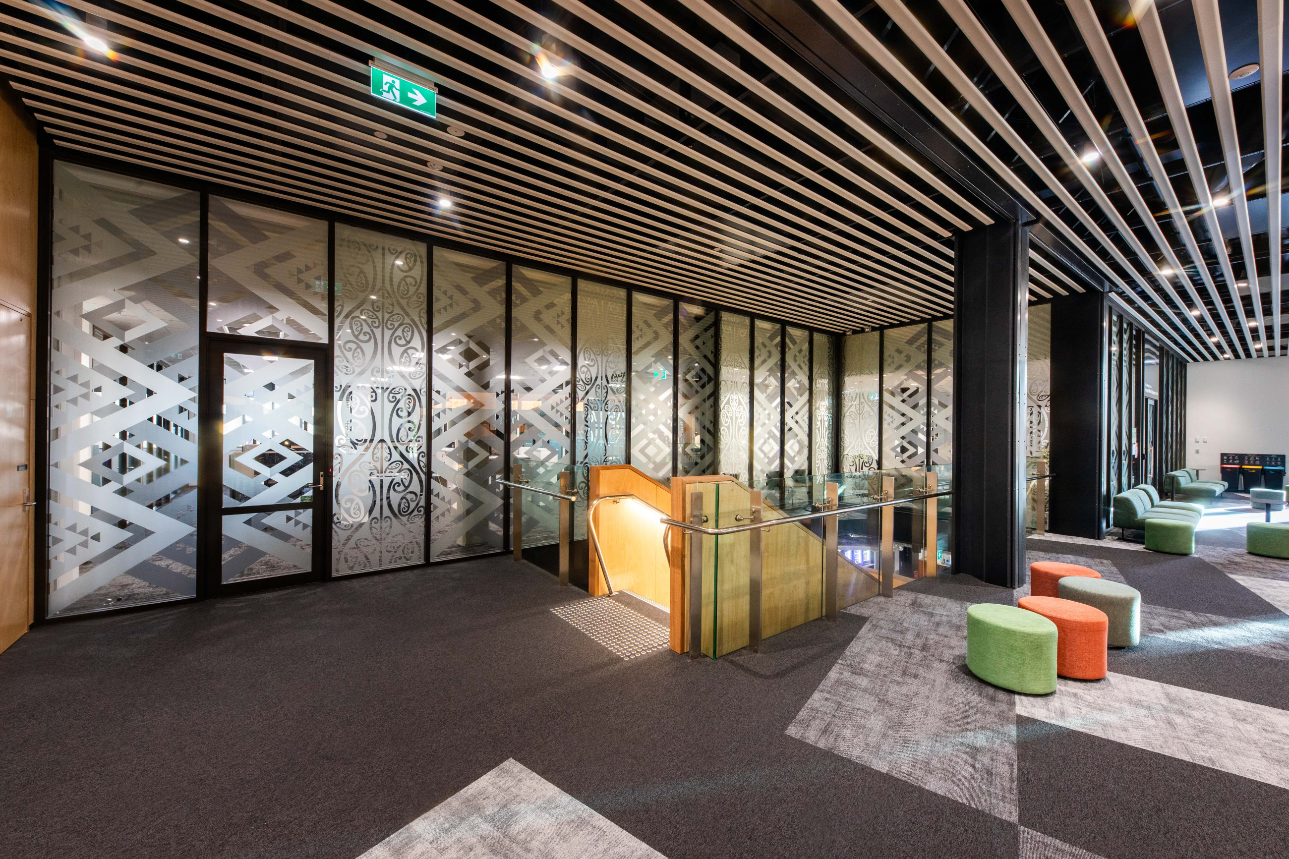 Glass is a major design feature of the building with the 12 dramatic full height glass panels to the front entrance of the Wharenui requiring specialised design on the framing from Wight Aluminium and specialised lifting gear to be sourced especially for this job. These glass panels are designed for maximum clarity and thermal performance. Glass for the external façade was specified for clarity, thermal performance and sound reduction. A major feature of all glass used throughout this project was the use of Low Iron Glass, also referred to as extra clear. Low Iron glass has low iron content as part of the raw materials and doesn’t have the green hue visible in standard clear glass. This glass type is used on the substrate of the SN63T, the inner ply of the double glazing, all frameless entries, all internal partitions and all balustrade panels. The specification of Low Iron Glass throughout the project enhances the clarity and flow of the shared spaces. It has also allowed the University of Waikato to showcase the stunning cultural features throughout the building to maximum effect.